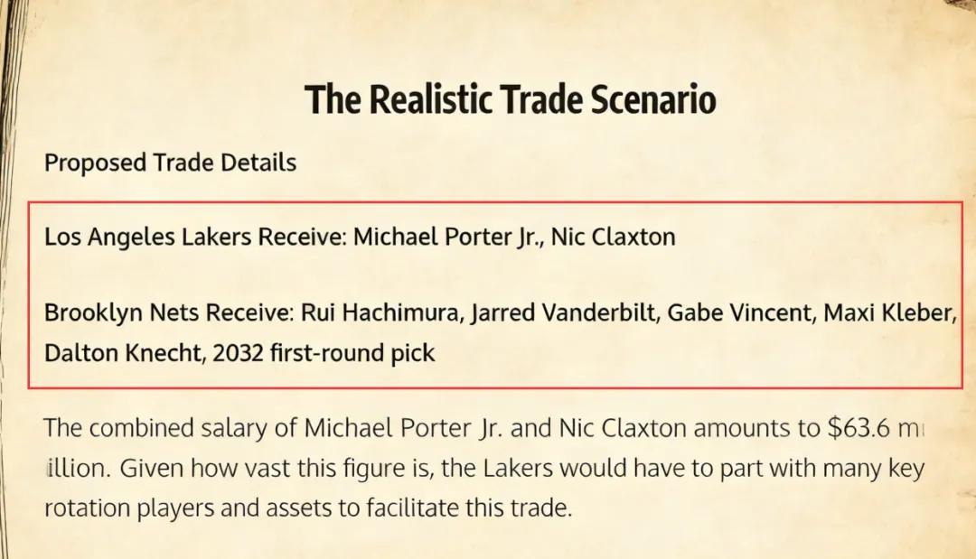 美媒《Fadeaway World》撰文建议,湖人可以将八村垒、范德比尔特、文森特、克莱伯、克内克特以及2032年的首轮签送到篮网,换回前锋小波特和内线克拉克斯顿。